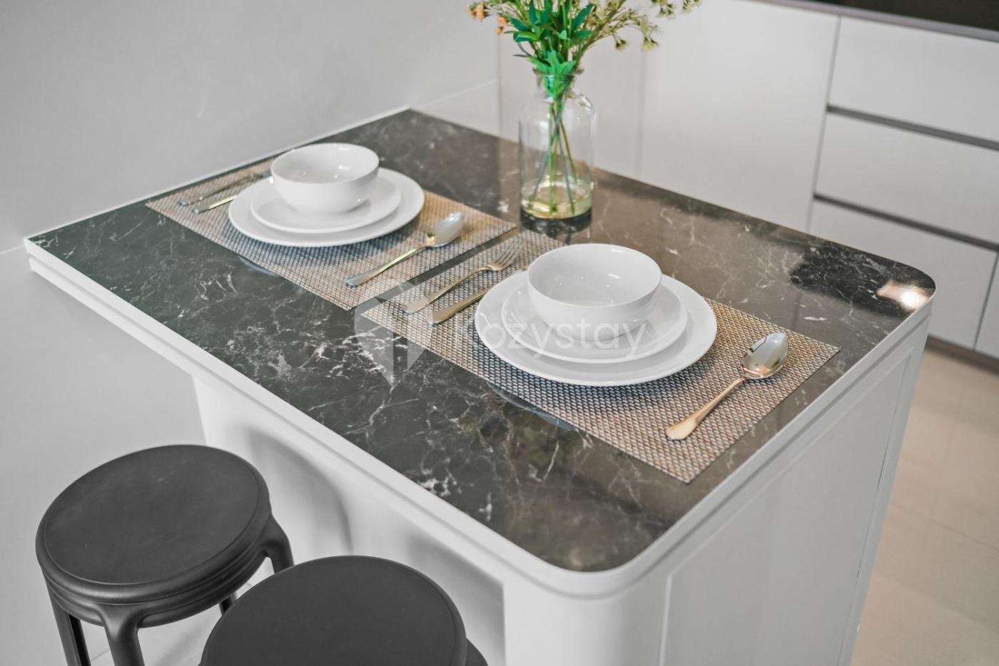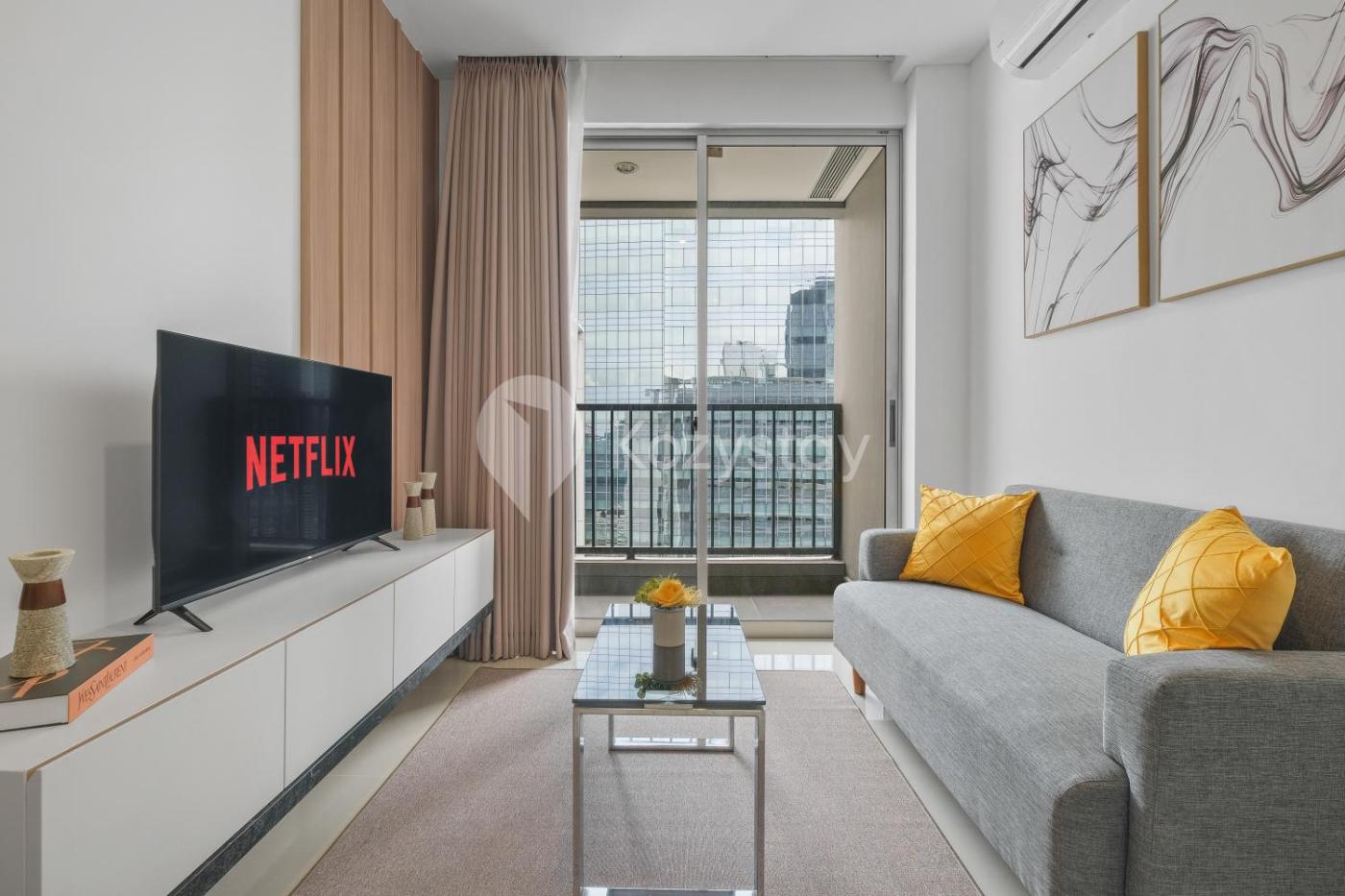 One-Bedroom Apartment. The air-conditioned apartment has 1 bedroom and 1 bathroom with a bidet and a hairdryer. Meals can be prepared in the well-fitted kitchen, which features a stovetop, a refrigerator, kitchenware and a microwave. Boasting a balcony with city views, this apartment also features a washing machine and a flat-screen TV with streaming services. The unit has 1 bed.