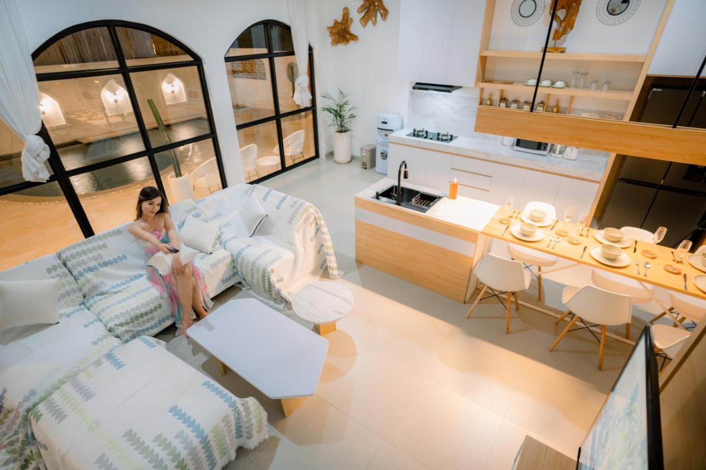 Three-Bedroom Villa. This villas standout feature is the private pool. Boasting a private entrance, this air-conditioned villa includes 1 living room, 3 separate bedrooms and 3 bathrooms with a bath and a shower. In the well-equipped kitchen, guests will find a stovetop, a refrigerator, kitchenware and a microwave. The spacious villa offers a tea and coffee maker, a seating area, a dining area as well as a terrace with sea views. The unit has 3 beds.