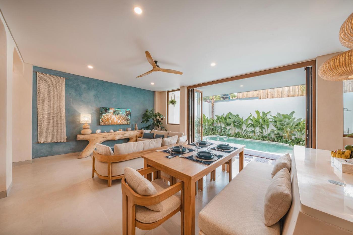 Two-Bedroom Villa. This villas special feature is the private pool. Featuring a private entrance, this air-conditioned villa consists of 1 living room, 2 separate bedrooms and 2 bathrooms with a bath and a shower. Meals can be prepared in the kitchen, which is equipped with a stovetop, a refrigerator, kitchenware and a microwave. Boasting a terrace with garden views, this villa also provides a coffee machine and a flat-screen TV with streaming services. The unit offers 3 beds.