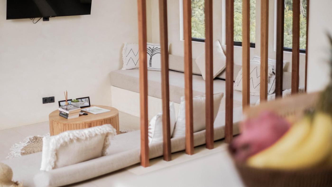 The villa has 2 bedrooms, 2 bathrooms, bed linen, towels, a flat-screen TV with streaming services, a dining area, a fully equipped kitchen, and a terrace with pool views. A private entrance leads gueststhe villa,they can enjoy some fruits and chocolates or cookies. This villa is non-smoking and soundproof.